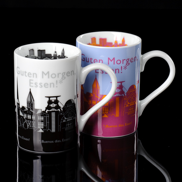 Kaffeebecher aus Porzellan mit Ihrer Stadtsilhouette.