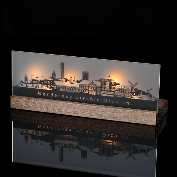 Leuchter in einem Buchenholzblock, in dem 3 Teelichter eingearbeitet sind, lassen Ihre Stadt hinter einer satinierten Acrylglasscheibe mit aufgedruckten Stadtmotiven lebendig aufleuchten.