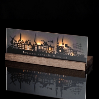 Leuchter in einem Buchenholzblock, in dem 3 Teelichter eingearbeitet sind, lassen Ihre Stadt hinter einer satinierten Acrylglasscheibe mit aufgedruckten Stadtmotiven lebendig aufleuchten.