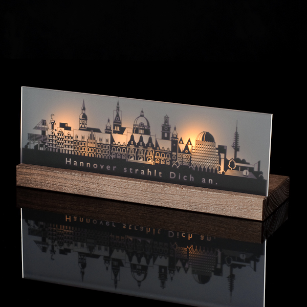 Leuchter in einem Buchenholzblock, in dem 3 Teelichter eingearbeitet sind, lassen Ihre Stadt hinter einer satinierten Acrylglasscheibe mit aufgedruckten Stadtmotiven lebendig aufleuchten.