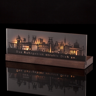 Leuchter in einem Buchenholzblock, in dem 3 Teelichter eingearbeitet sind, lassen Ihre Stadt hinter einer satinierten Acrylglasscheibe mit aufgedruckten Stadtmotiven lebendig aufleuchten.