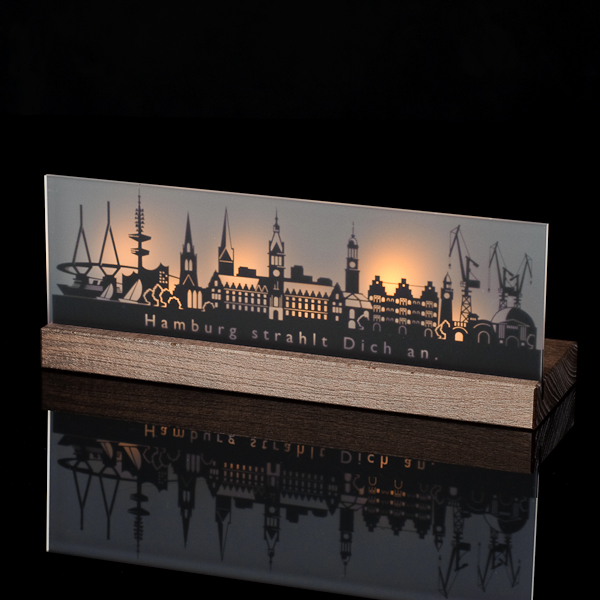 Leuchter in einem Buchenholzblock, in dem 3 Teelichter eingearbeitet sind, lassen Ihre Stadt hinter einer satinierten Acrylglasscheibe mit aufgedruckten Stadtmotiven lebendig aufleuchten.