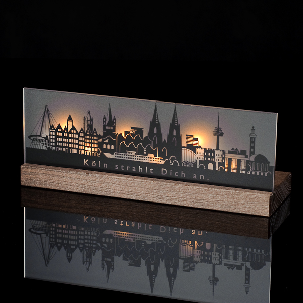Leuchter in einem Buchenholzblock, in dem 3 Teelichter eingearbeitet sind, lassen Ihre Stadt hinter einer satinierten Acrylglasscheibe mit aufgedruckten Stadtmotiven lebendig aufleuchten.